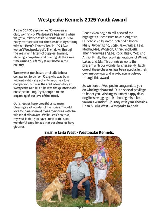 The Chesapeake Bay Retriever Club of Canada is proud to present a Youth Award to promote and recognize youth choosing to dedicate their time to the Chesapeake breed by competing in CKC, UKC or AKC sanctioned events. .